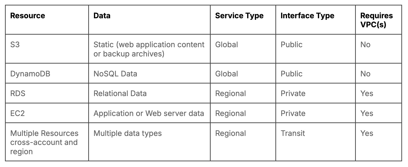 Global services, such as DynamoDB (a NoSQL database) also use a public interface, though there are not many global services compared to regional services when it comes to transferring data.